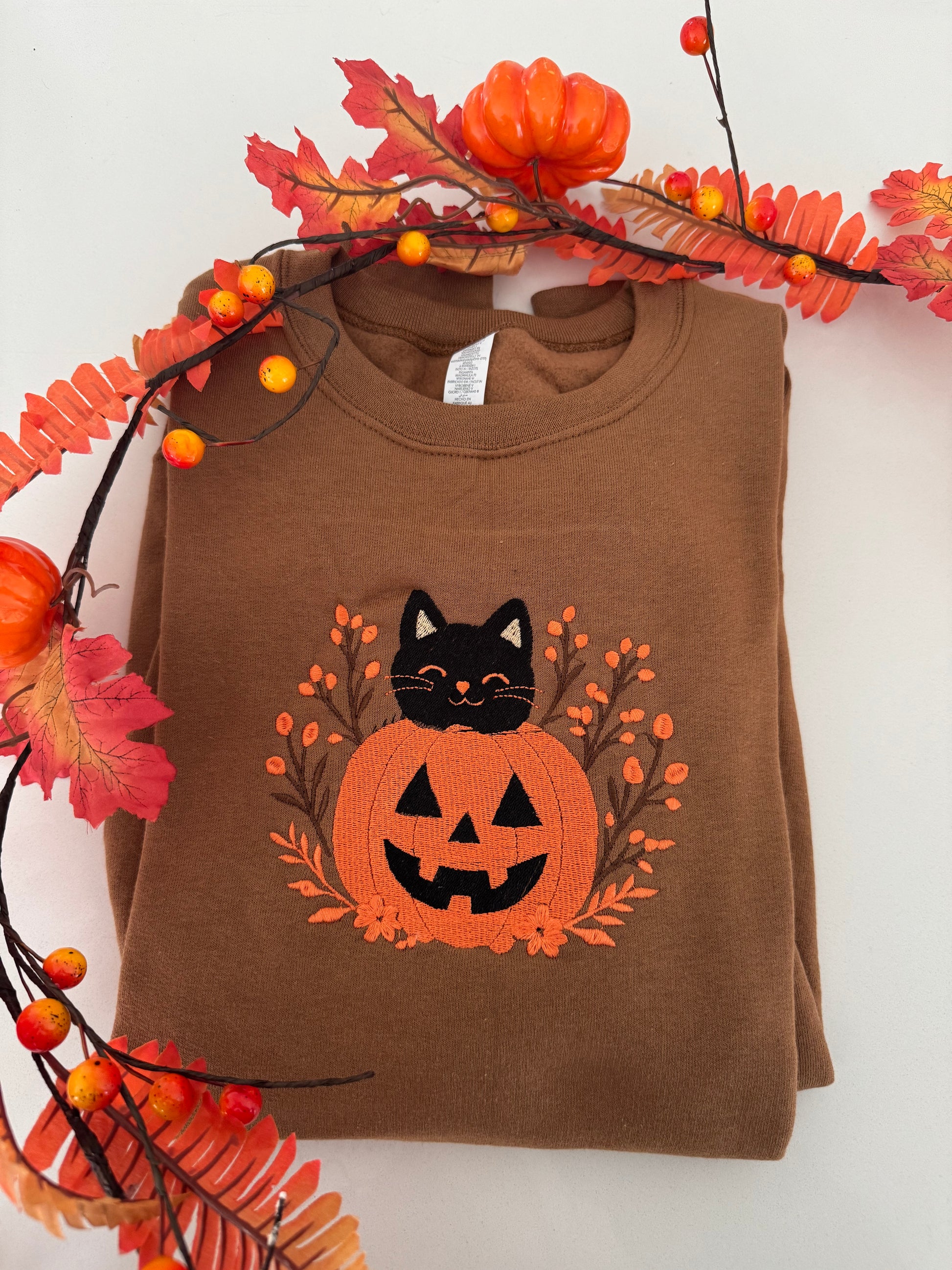 Professionally embroidered black cat + pumpkin design 🧵