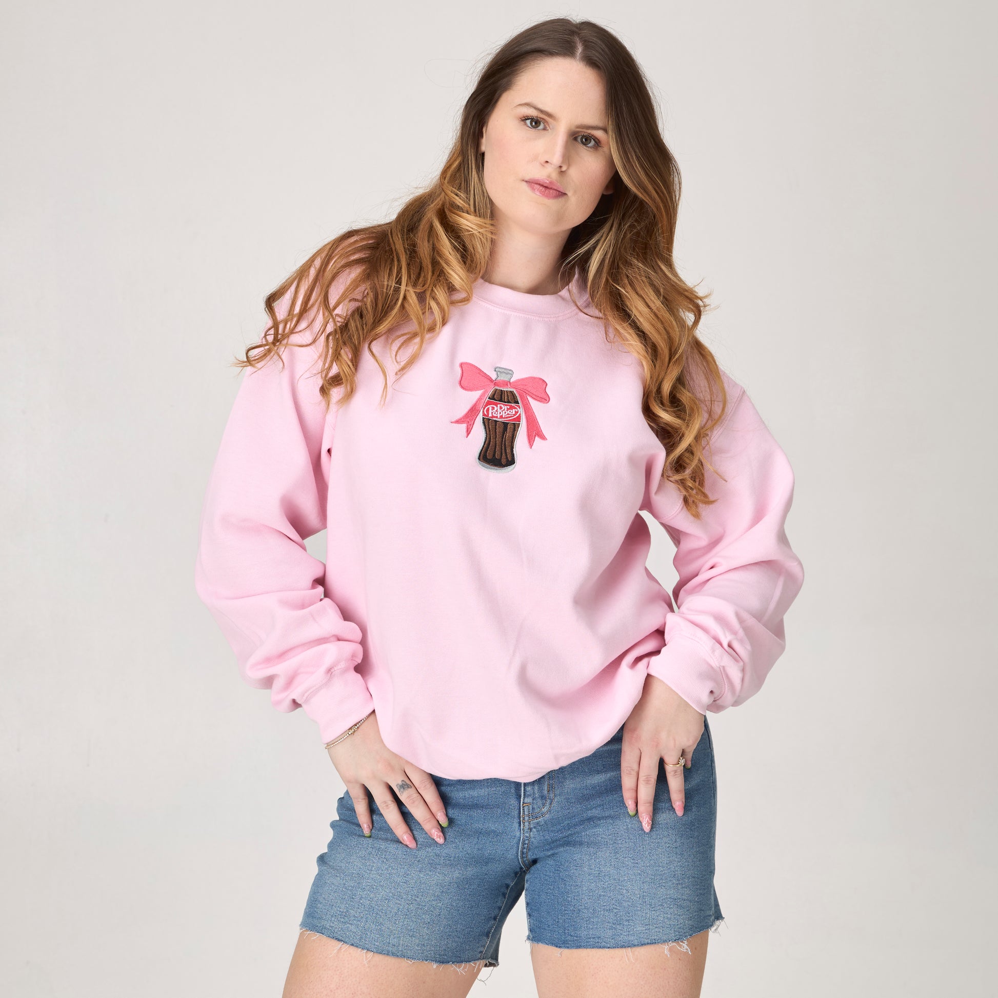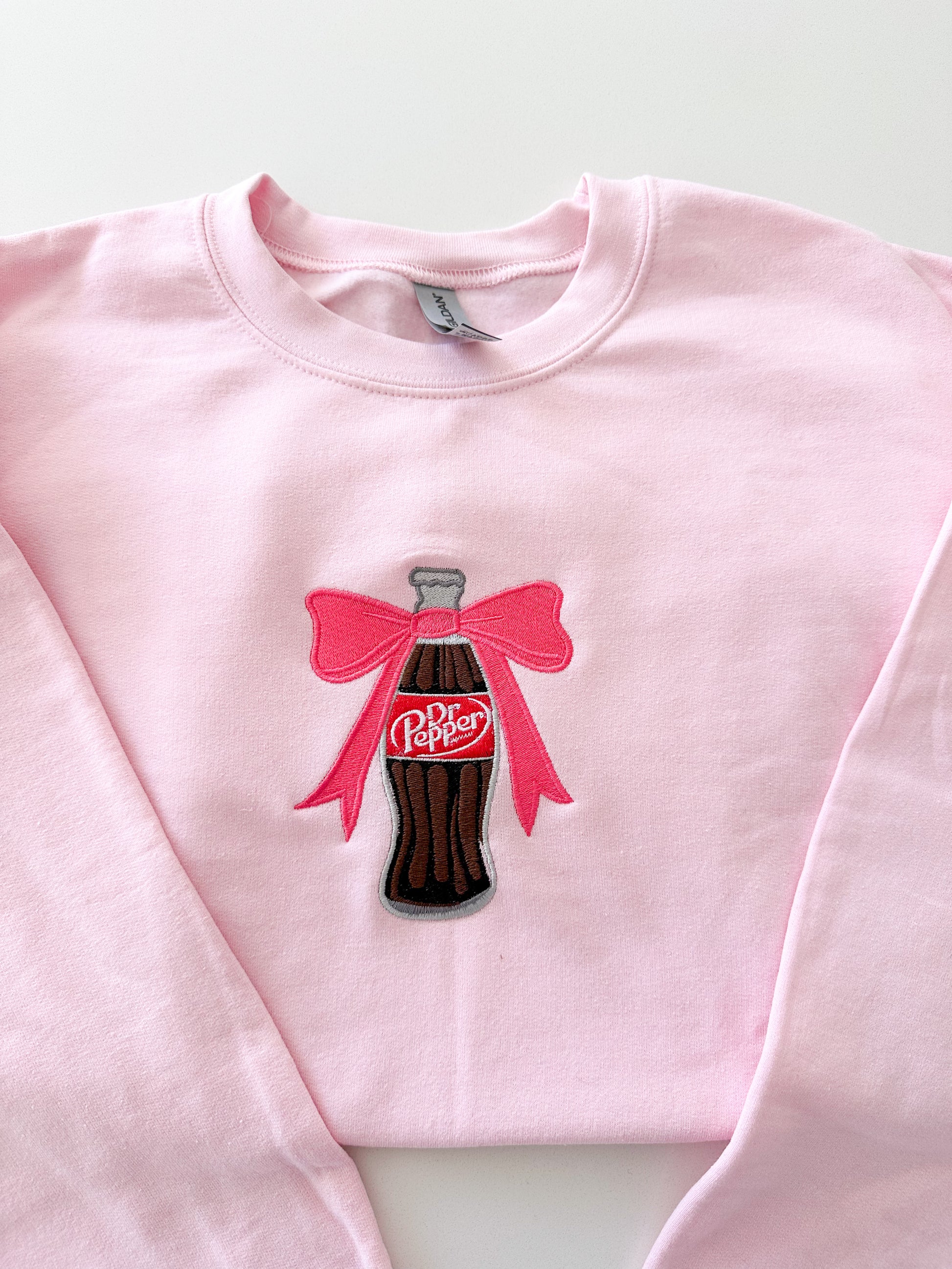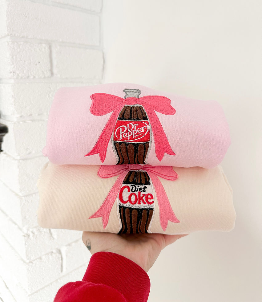 🎀 A soda lover’s dream with a girly twist! This embroidered sweatshirt features a vintage-style glass soda bottle wrapped in a pink bow, adding the perfect blend of cute and classic to your cozy wardrobe.