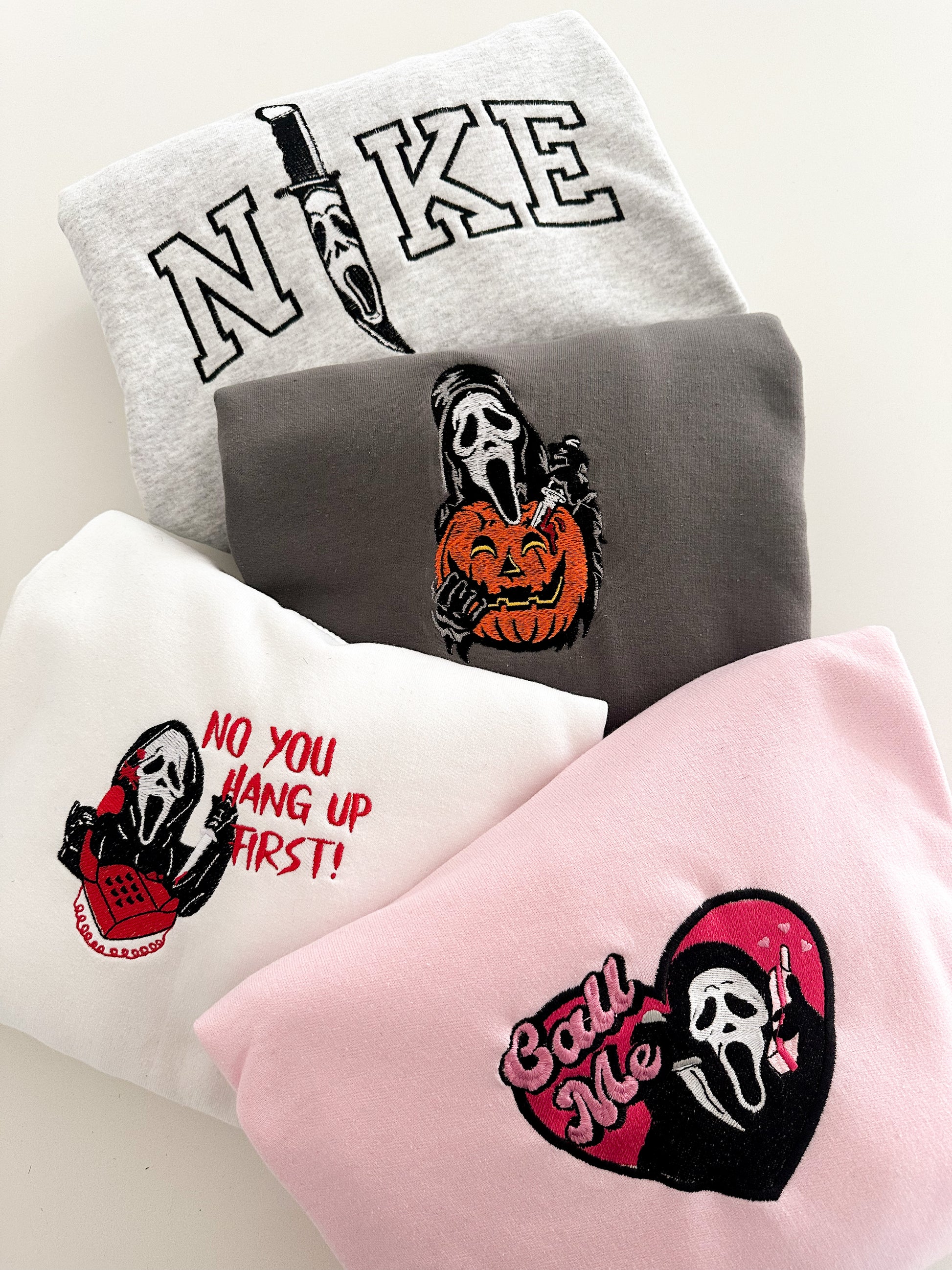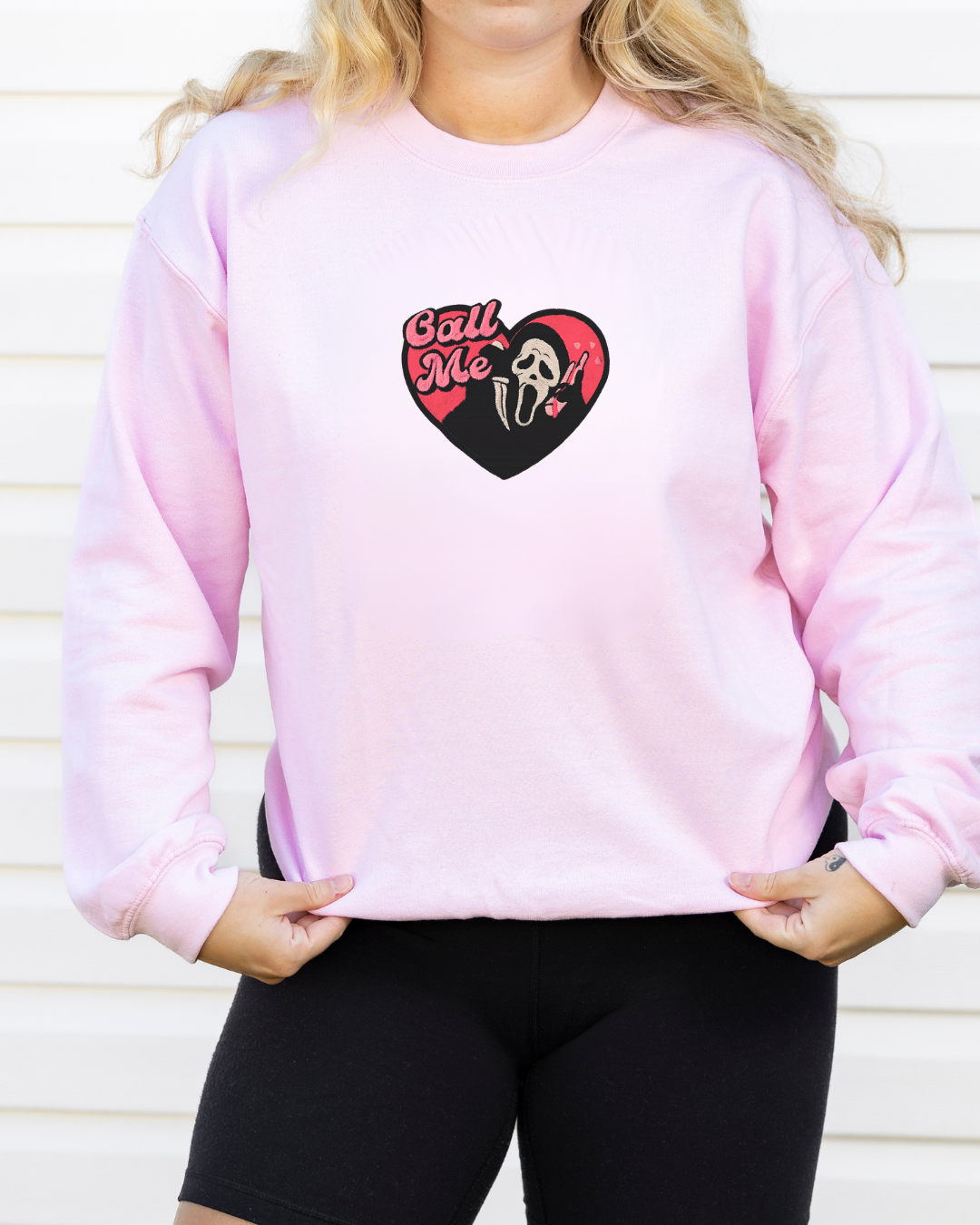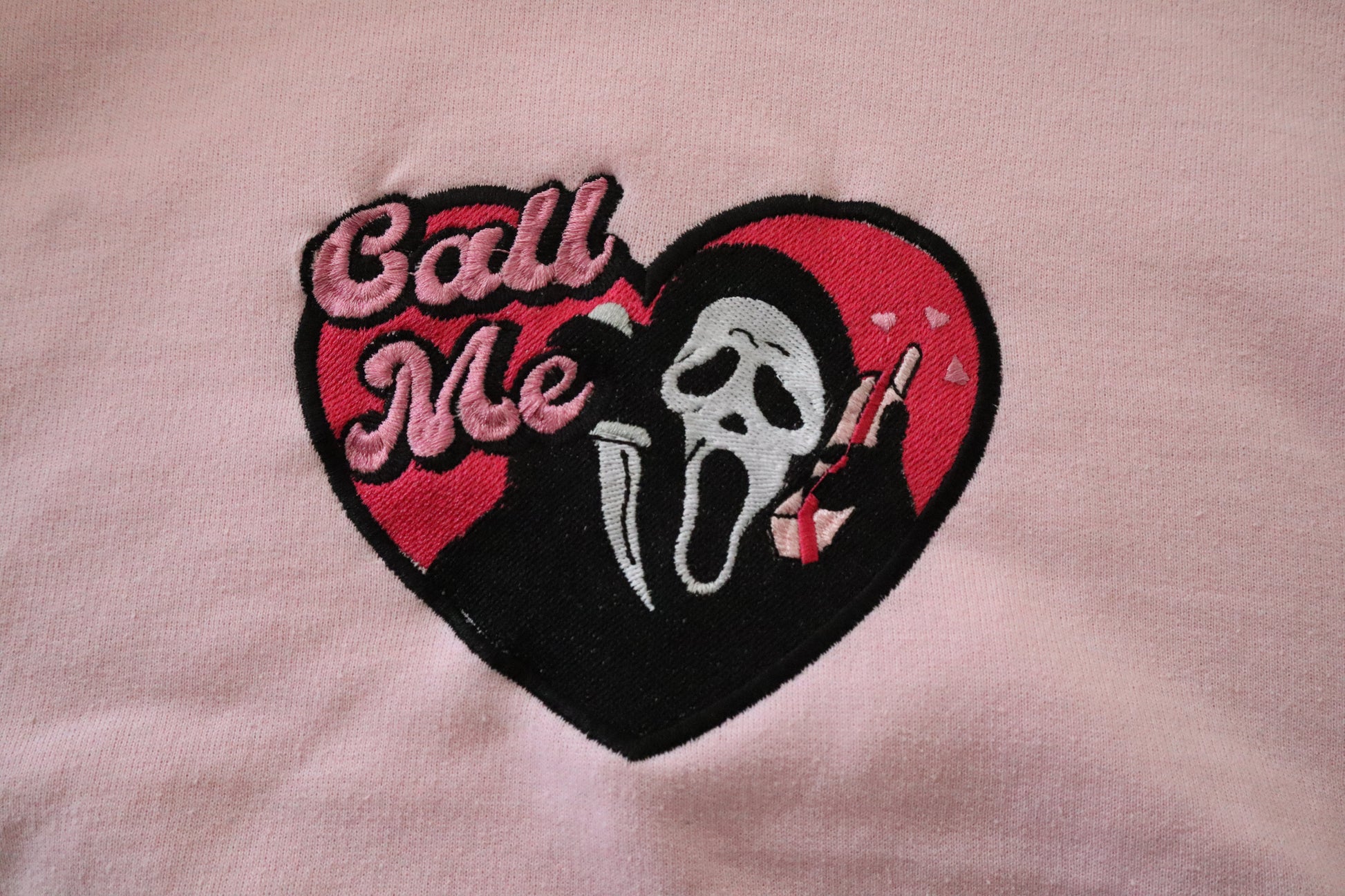 Sweet but spooky, the Call Me Embroidered Crewneck or Hoodie blends horror vibes with a playful twist. This pastel pink design features a heart-shaped patch with the iconic ghost face, a retro red phone, and cheeky “Call Me” lettering in bold embroidery. Whether you choose the cozy crewneck or the laid-back hoodie, both are made from a soft cotton-poly blend with a plush fleece interior — perfect for year-round wear, from lounging at home to stepping out with scream-queen style.