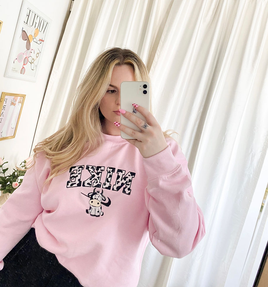 🐄 The cutest country-inspired sweatshirt! Featuring a playful embroidered cow and bold cow-print varsity lettering, this cozy piece adds the perfect rustic charm to your wardrobe.