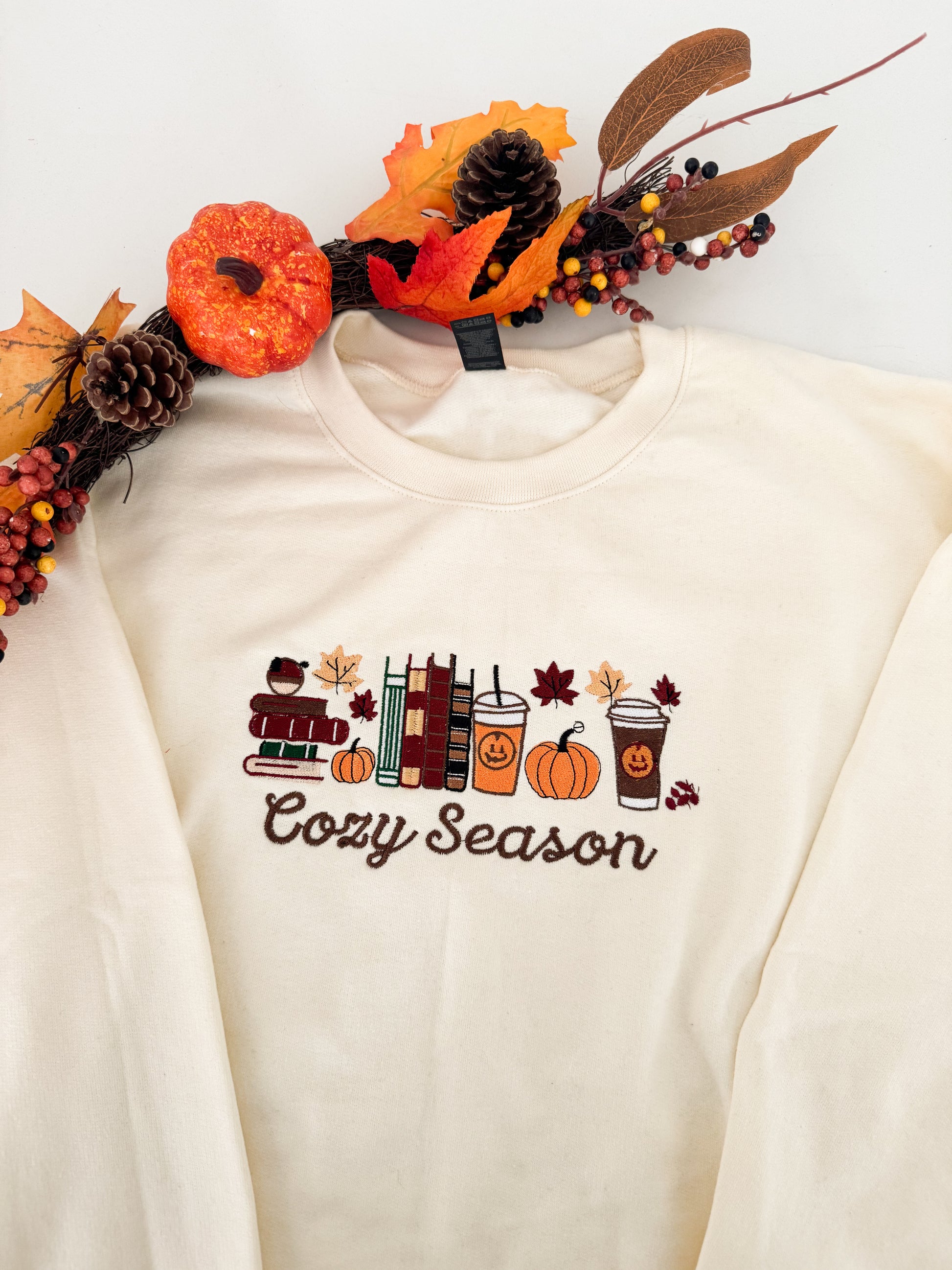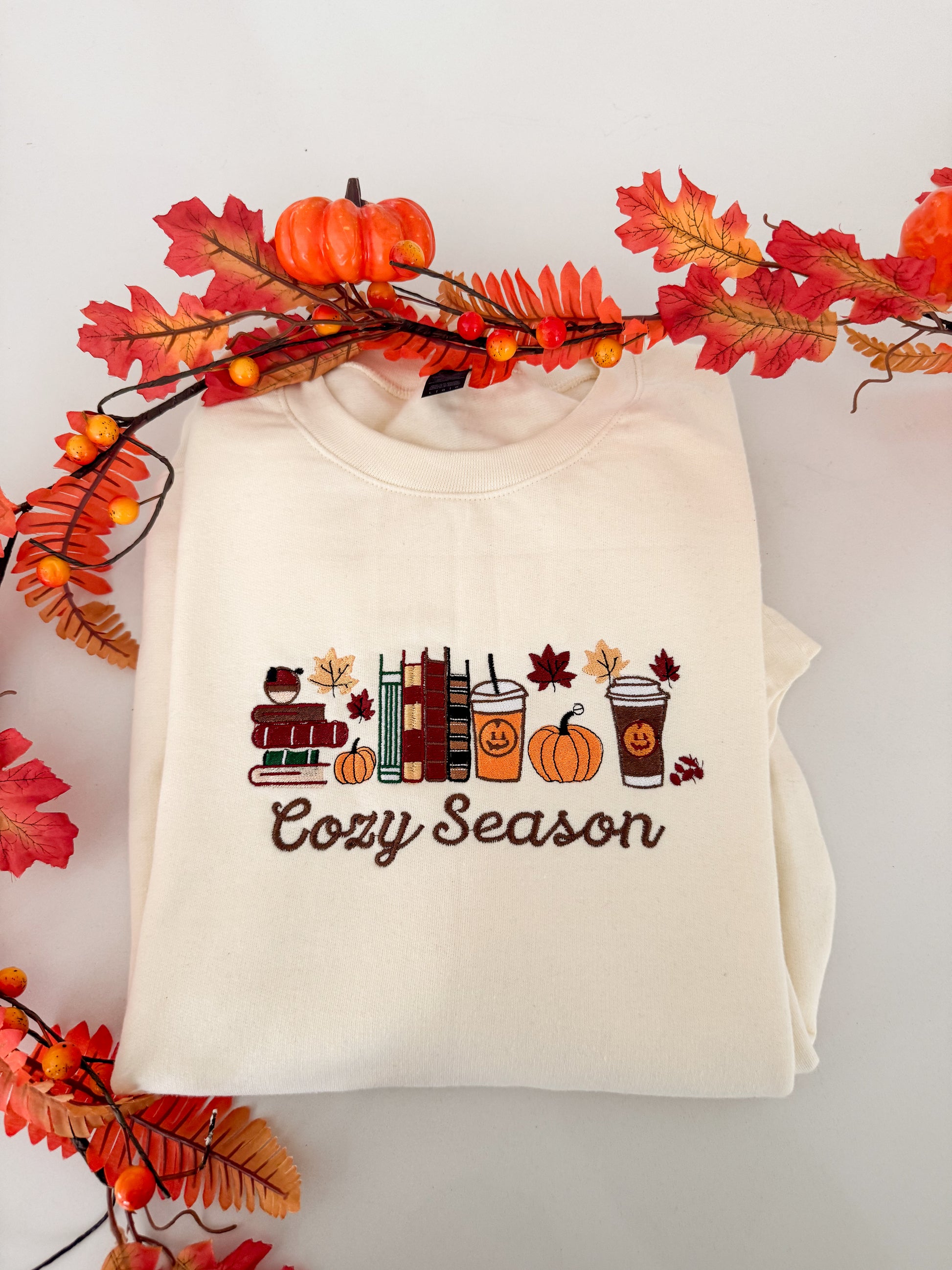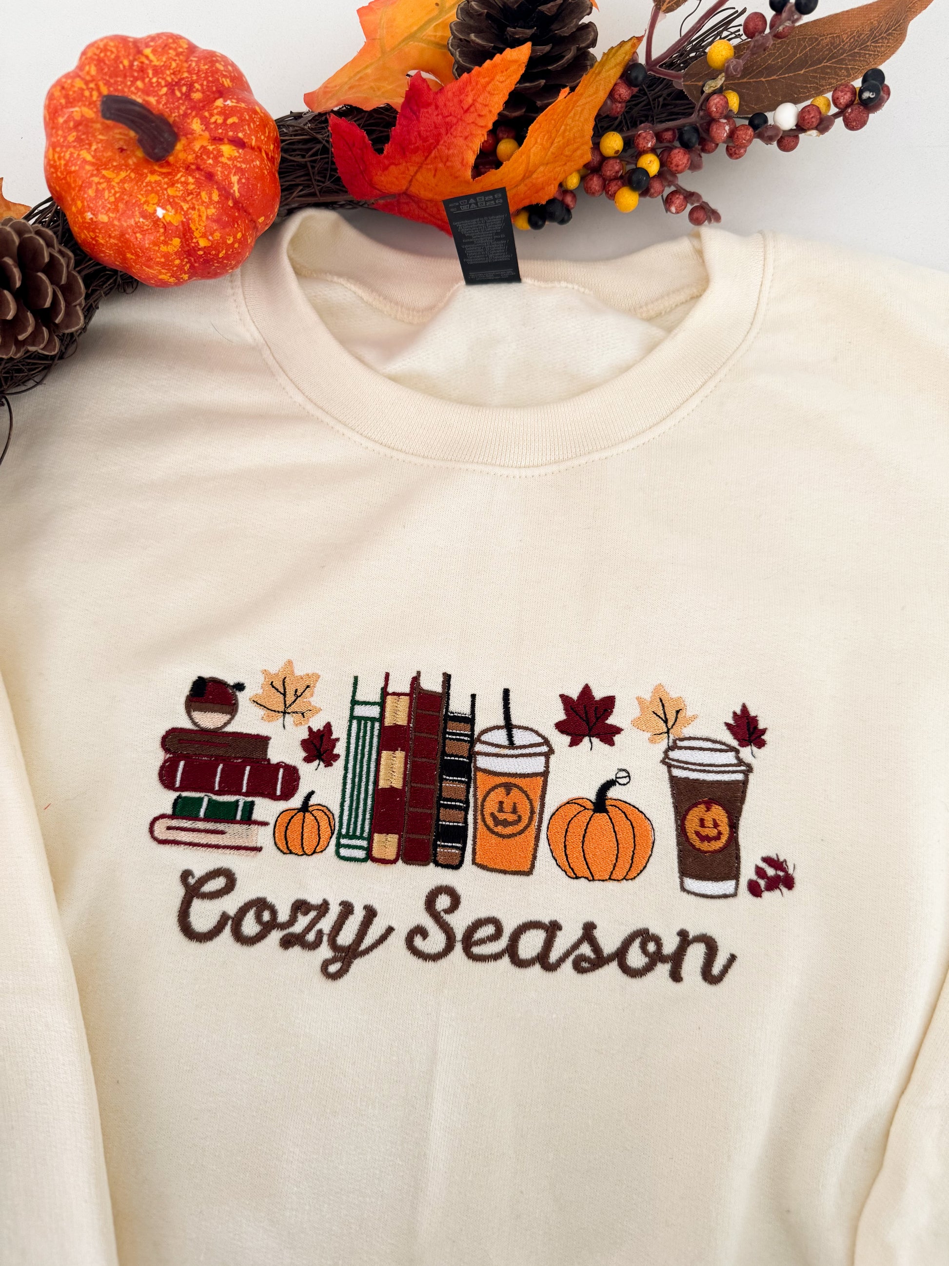 Wrap yourself in autumn vibes with our Cozy Season Embroidered Sweatshirt 🍂✨. Designed with detailed embroidery, this fall essential features stacked books, pumpkins, coffee cups, and colorful autumn leaves—perfect for anyone who loves crisp days and cozy nights.