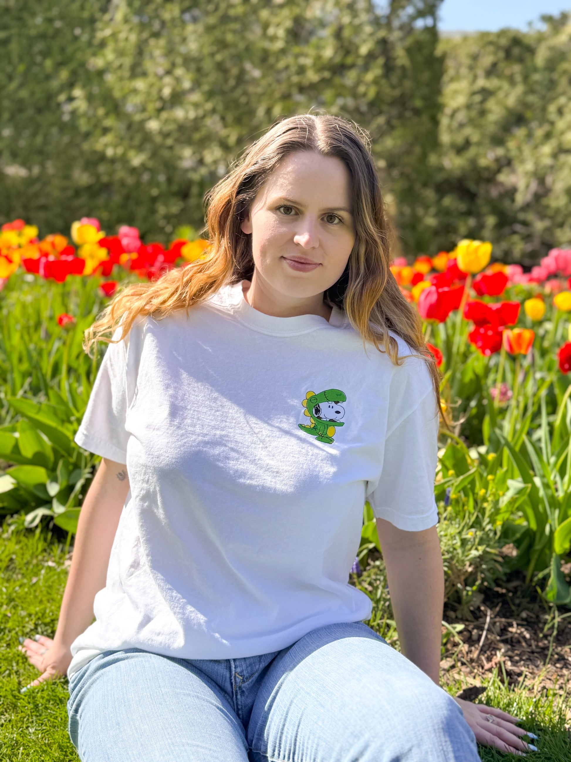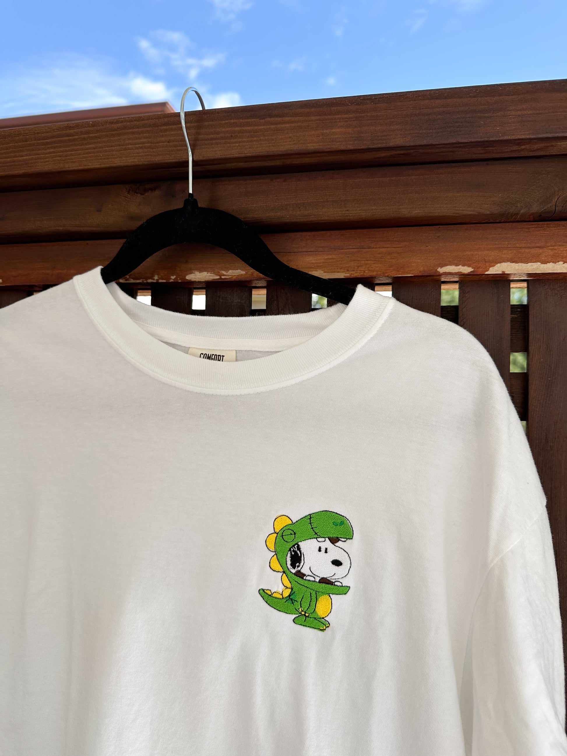 Comfy, a little chaotic, and unapologetically cute — this white tee features a tiny embroidered pup dressed in a full-on dinosaur suit. It’s giving “don’t mess with me” energy in the most adorable way possible.