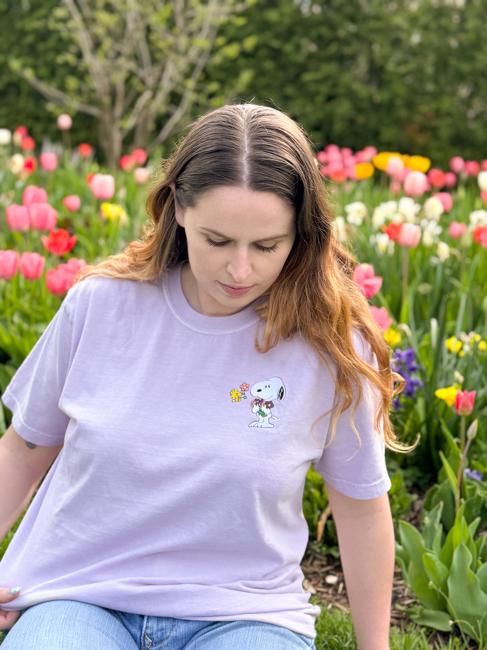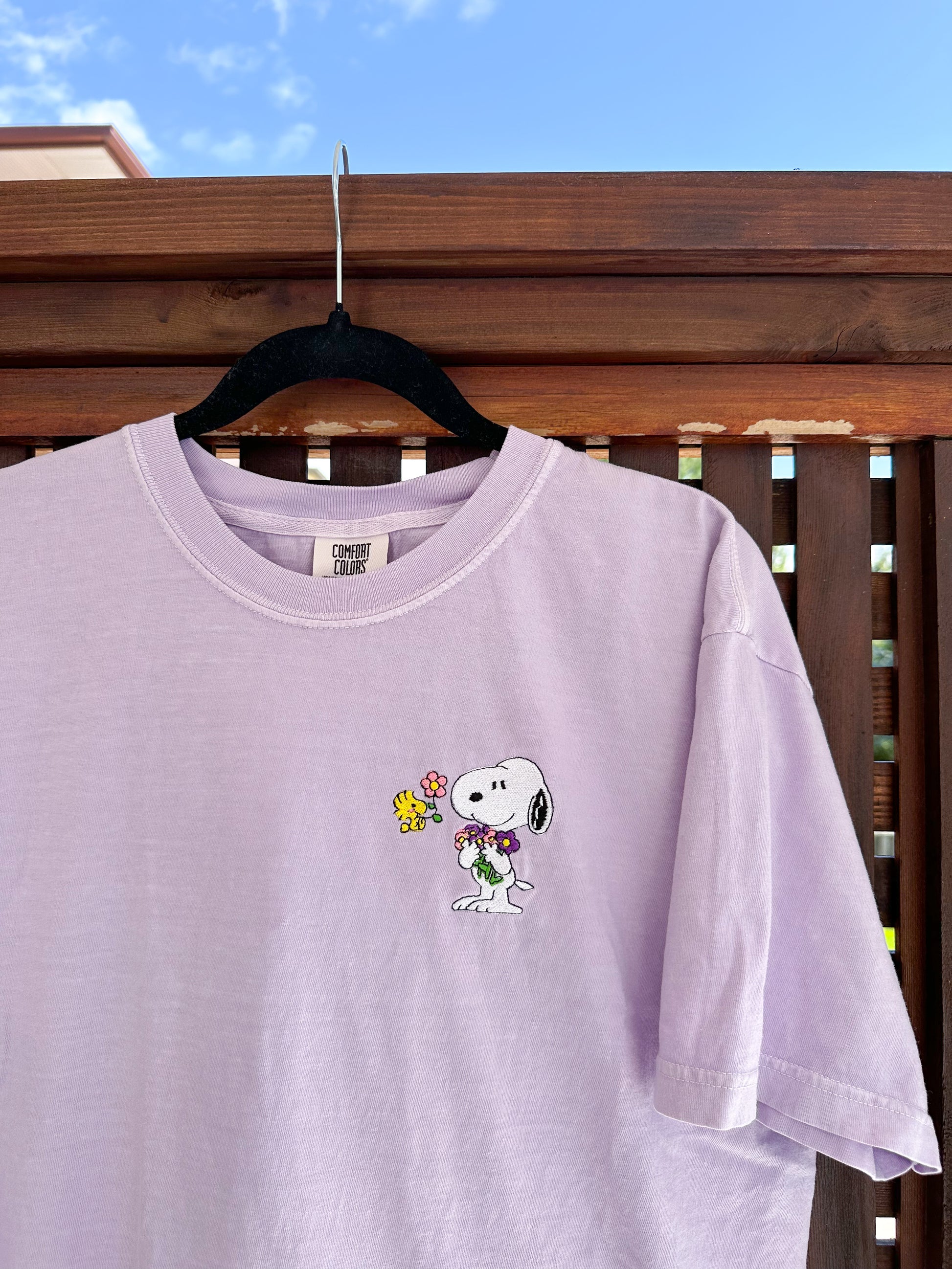 This soft lilac tee keeps it simple with a tiny embroidered pup and his feathered sidekick, sharing a sweet little moment. Easygoing, minimal, and made for those low-effort, high-vibe days.