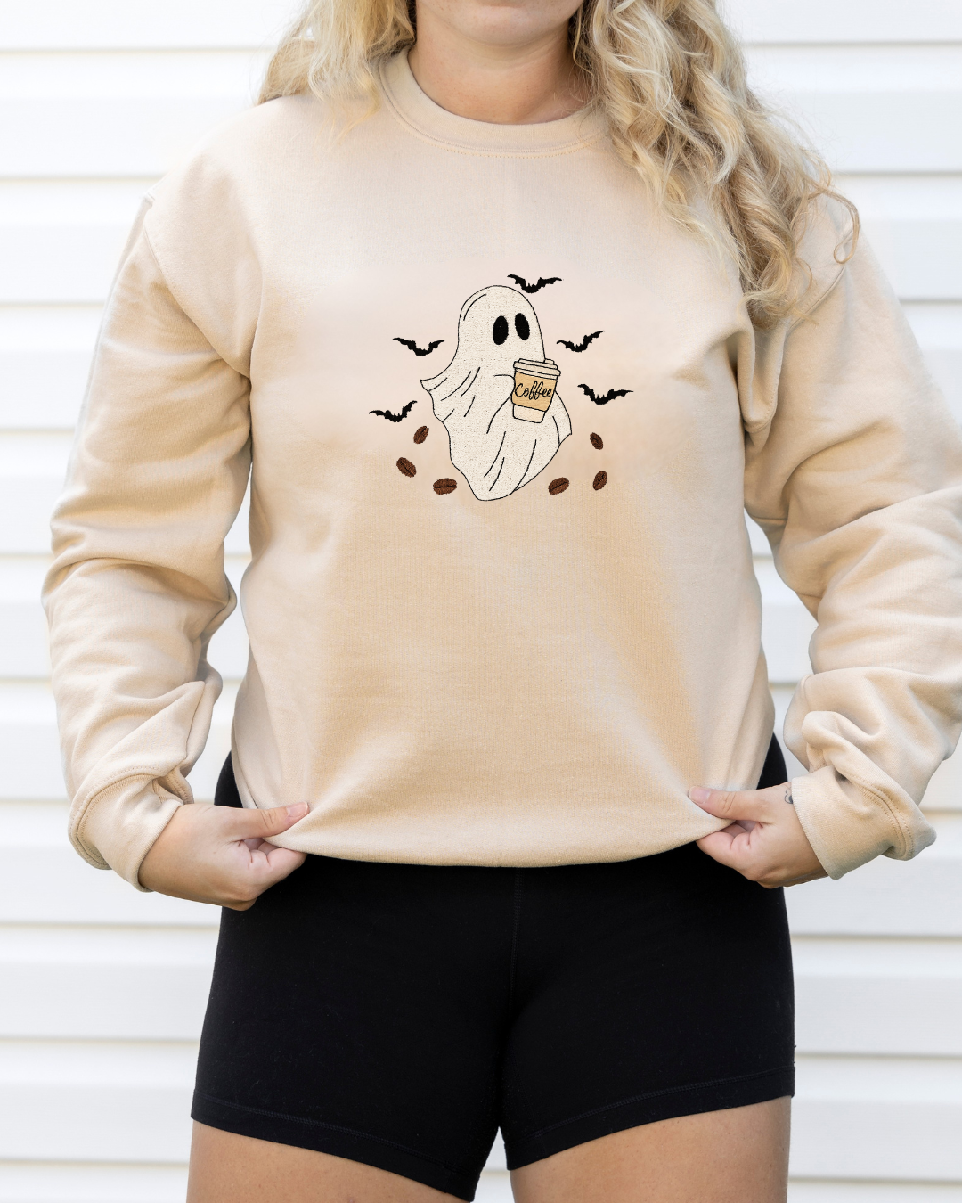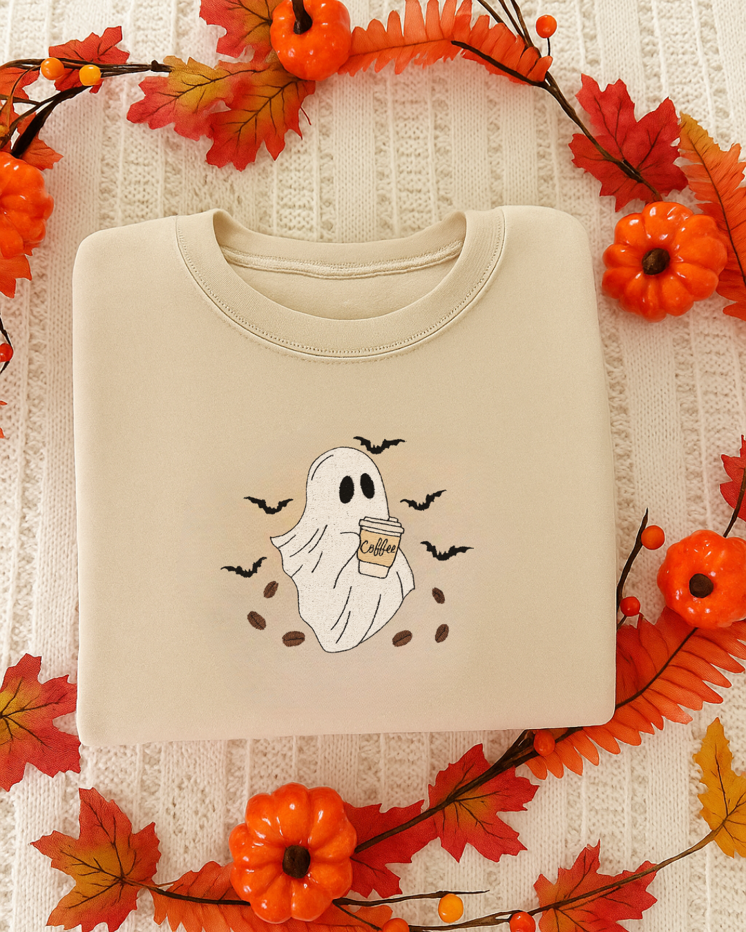 For those who run on caffeine and a little bit of spooky spirit — meet the Ghost Brew Embroidered Crewneck. This cozy beige sweatshirt features an adorable ghost clutching a coffee cup, surrounded by fluttering bats and scattered coffee beans. The high-quality embroidery brings every detail to life, making it the perfect mix of cute, caffeinated, and Halloween-ready. Crafted from a soft cotton-poly blend with a plush fleece interior, it’s designed for maximum comfort whether you’re sipping lattes at the pumpkin patch or binge-watching your favorite fall shows.