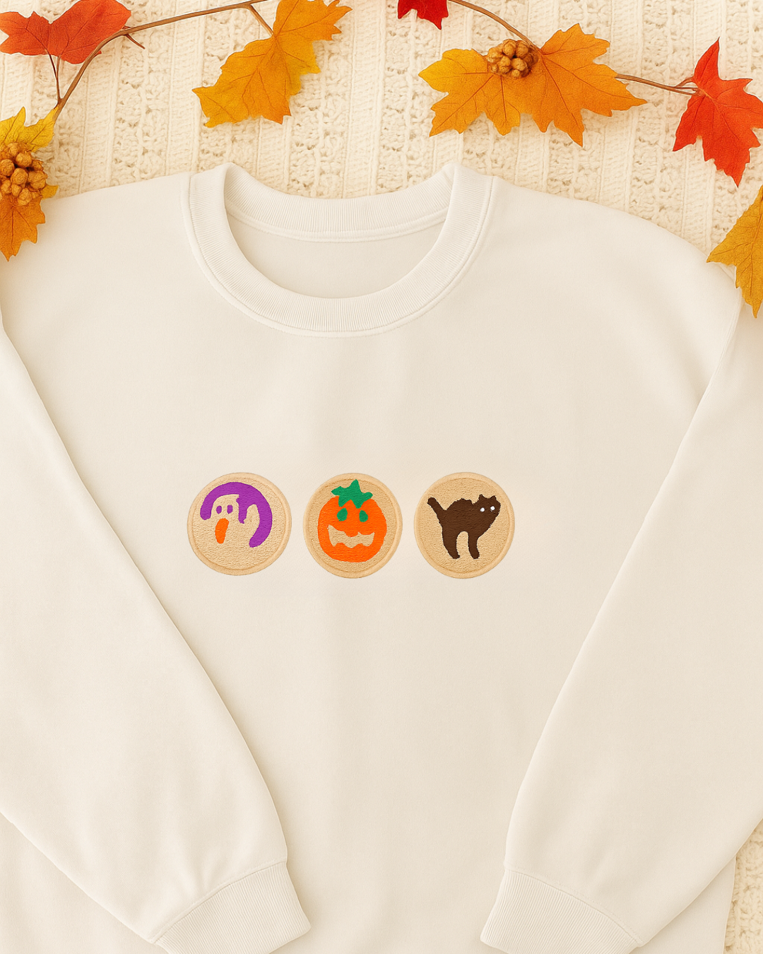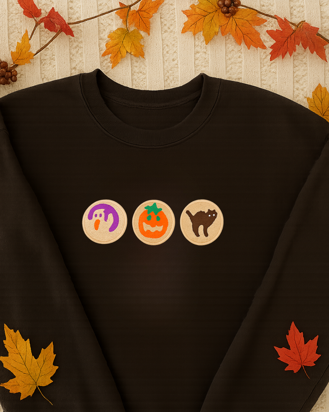 Sweet, spooky, and oh-so-cozy—our Halloween Cookies Crewneck is the perfect treat for spooky season. Featuring three embroidered cookie-style patches—a ghost, a jack-o’-lantern, and a black cat—this sweatshirt serves up all the festive vibes without the sugar rush.