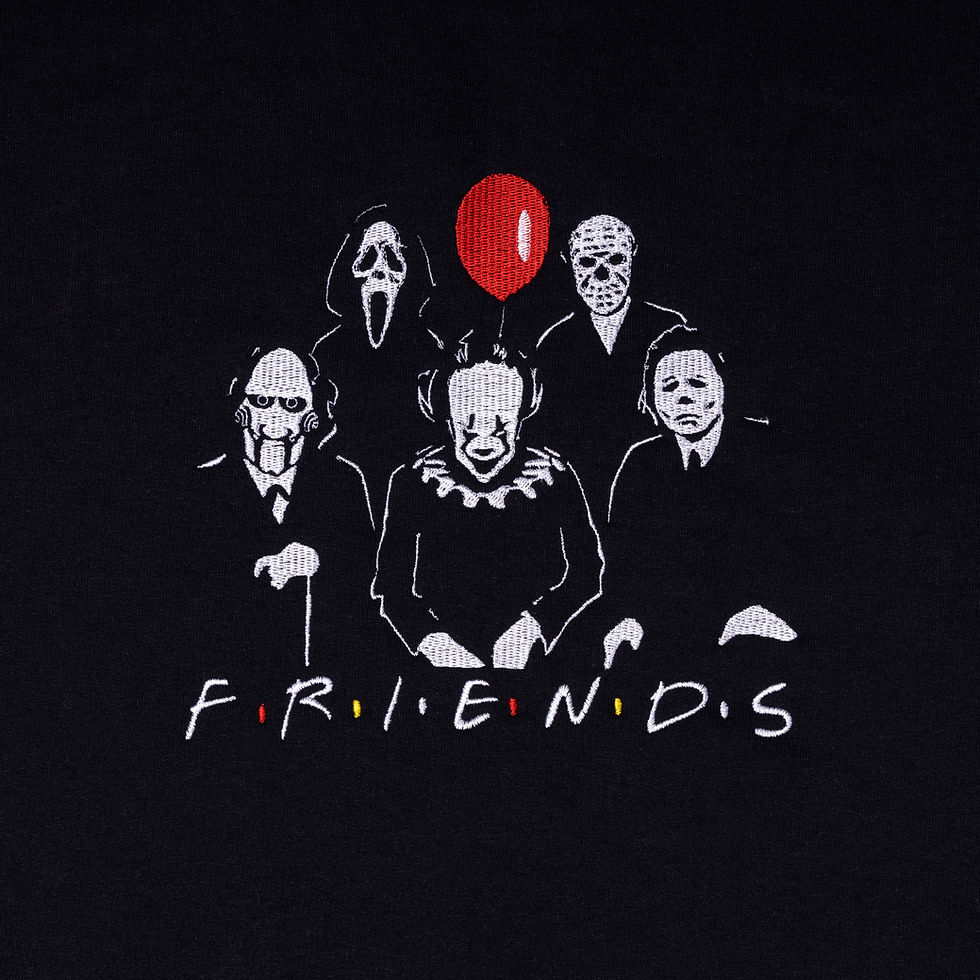 πͺπ For the ultimate horror fan! This high-quality embroidered sweatshirt features a lineup of iconic horror villains in a parody of the classic "Friends" logo. Whether you're a spooky season fanatic or love horror year-round, this cozy piece is a must-have!