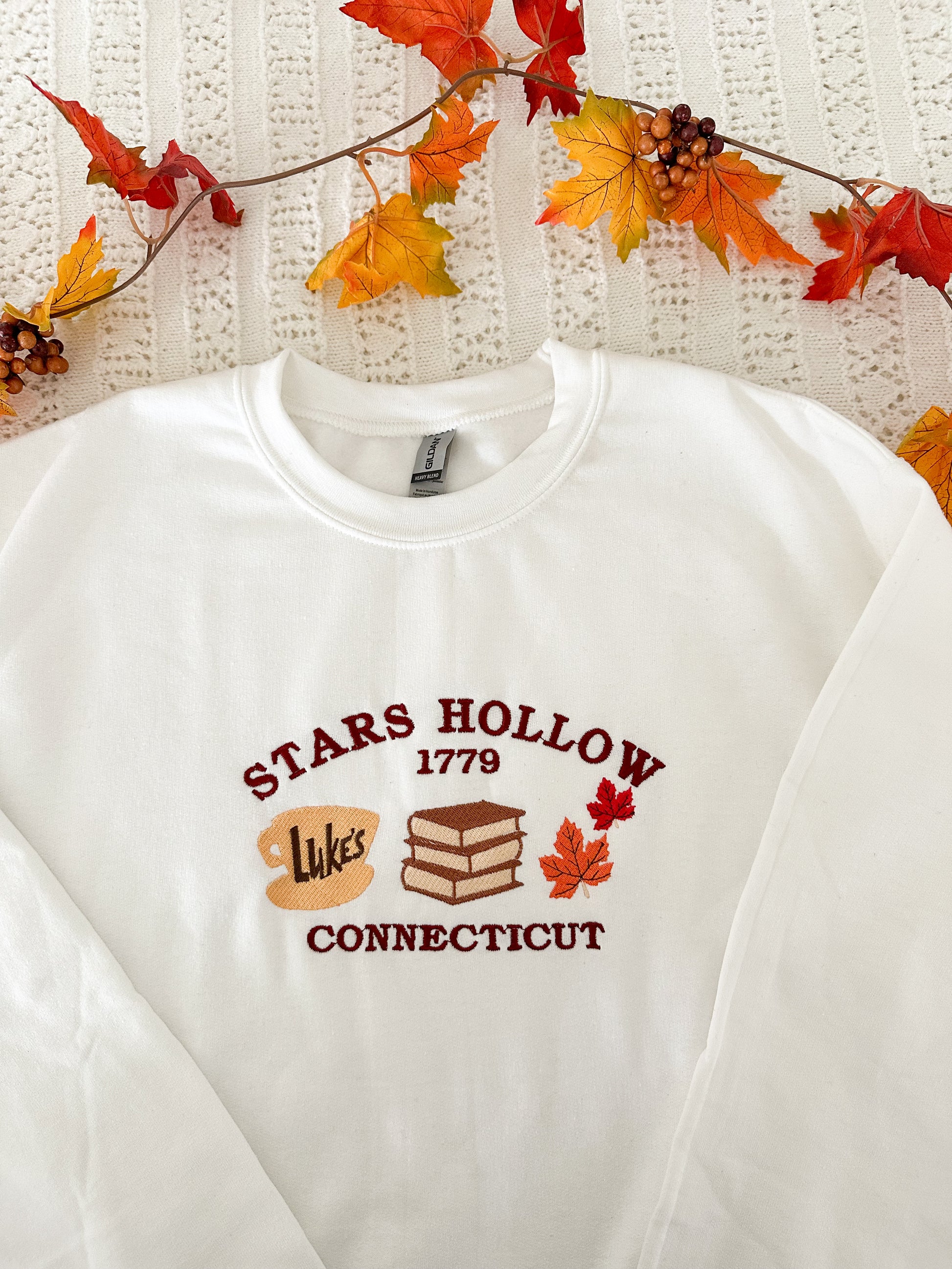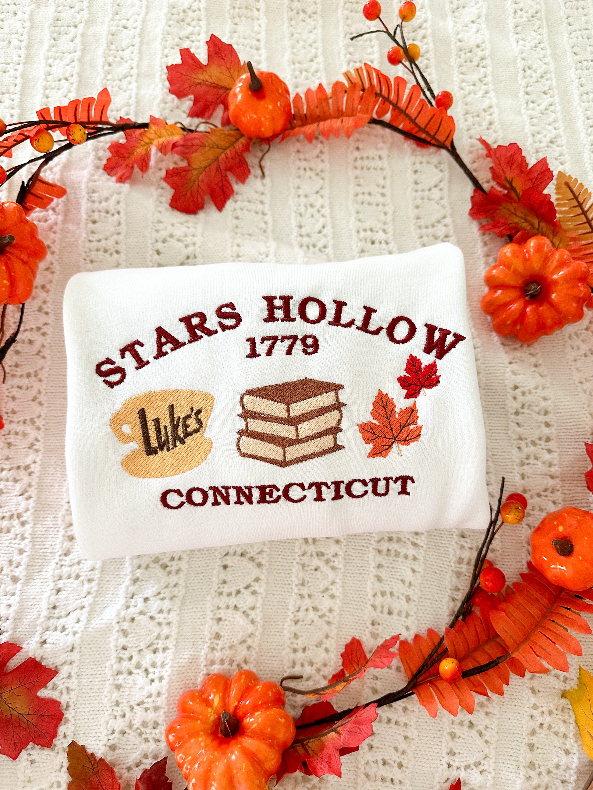 Bring the cozy charm of Connecticut’s most beloved small town into your wardrobe with this beautifully embroidered Stars Hollow sweatshirt. Featuring a nod to Luke’s Diner, stacked books, and falling leaves, this piece is perfect for layering up on crisp fall days or enjoying your favorite coffee in style.