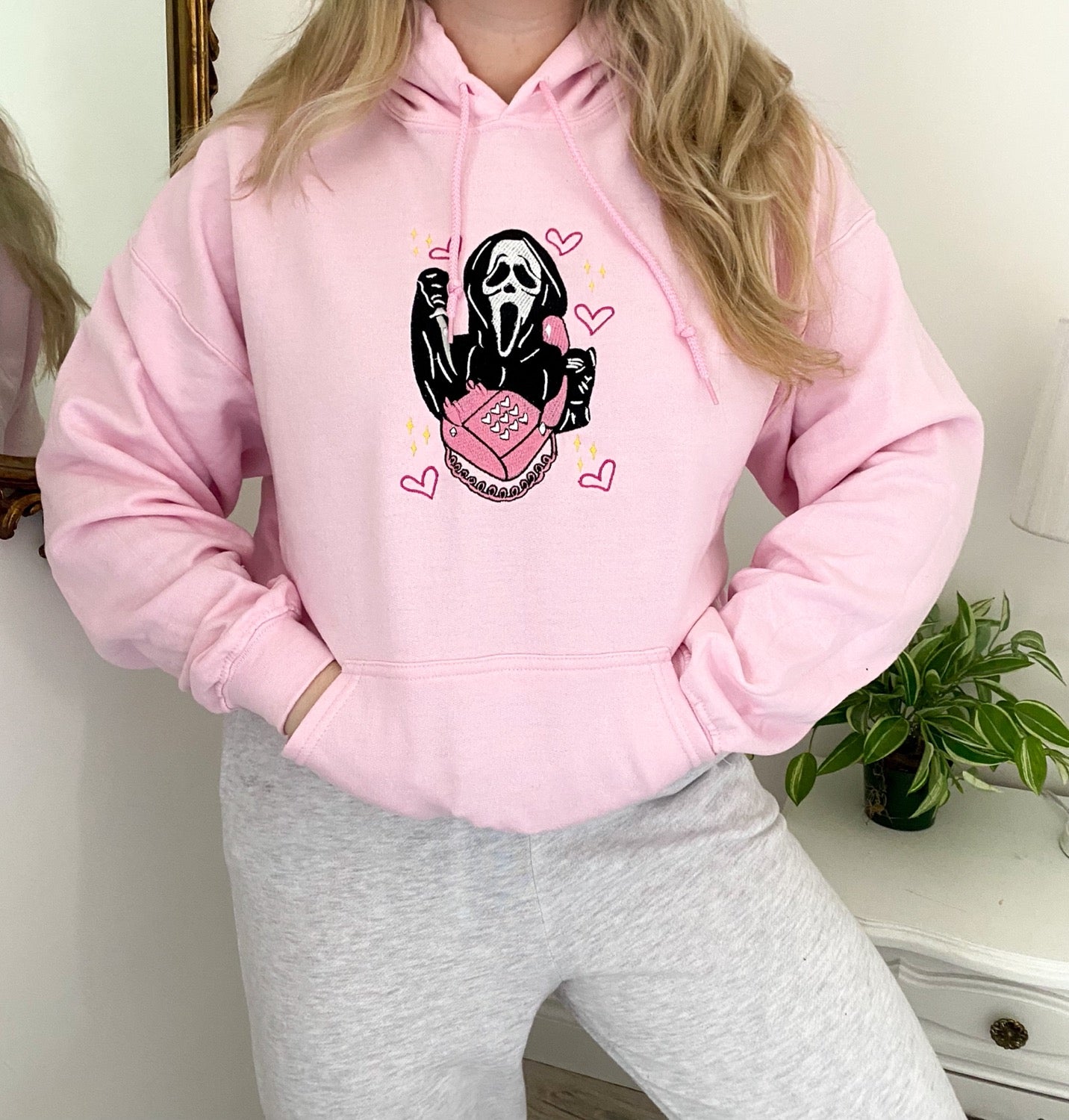 Creepy just got cute with the Sweet Scream Embroidered Hoodie 💕🔪📞 This cozy pastel pink hoodie features a playful twist on the classic horror icon, embroidered holding a retro telephone and surrounded by hearts and sparkles. Equal parts spooky and sweet, it’s the perfect hoodie for horror fans who love a soft aesthetic.