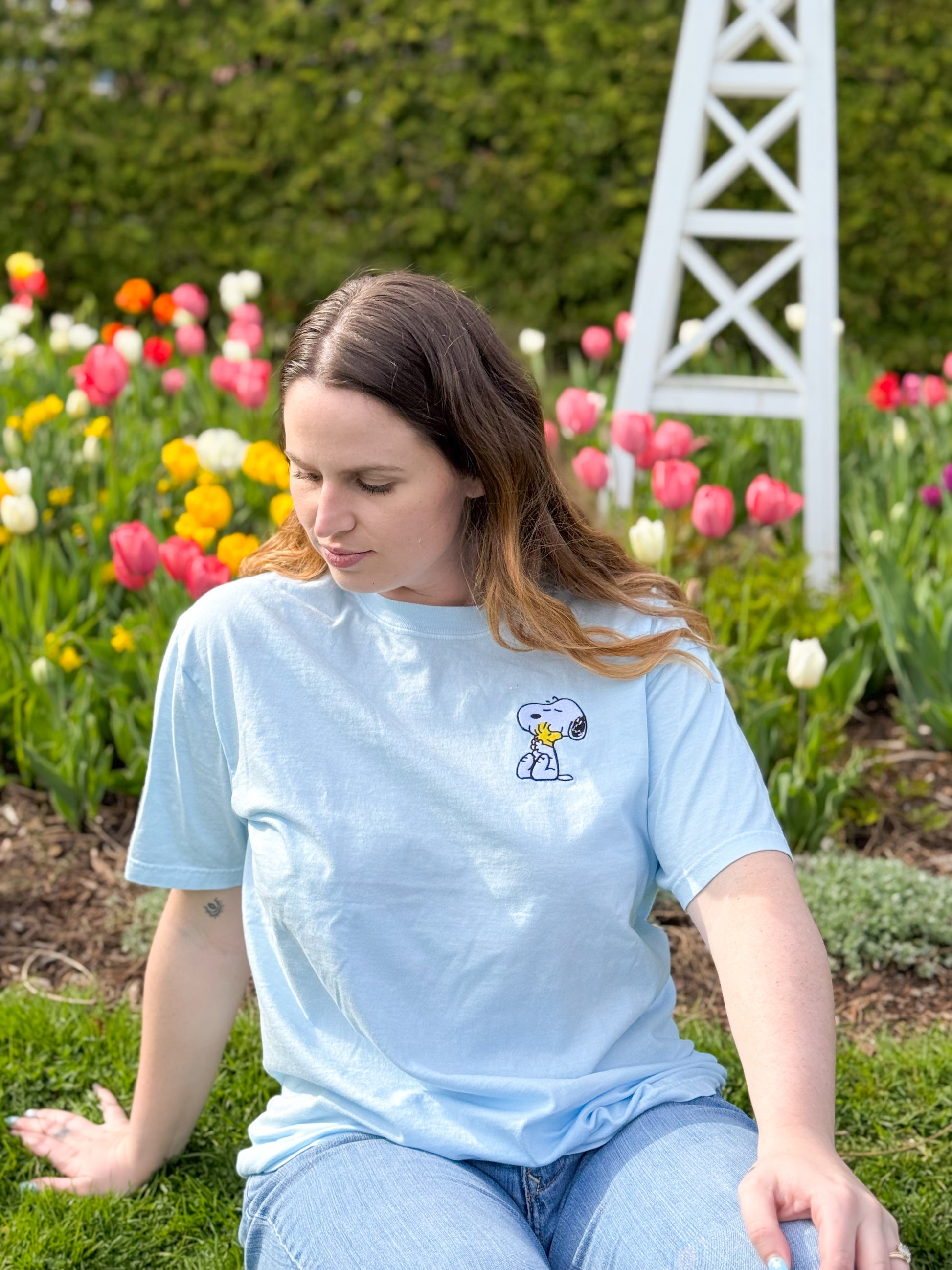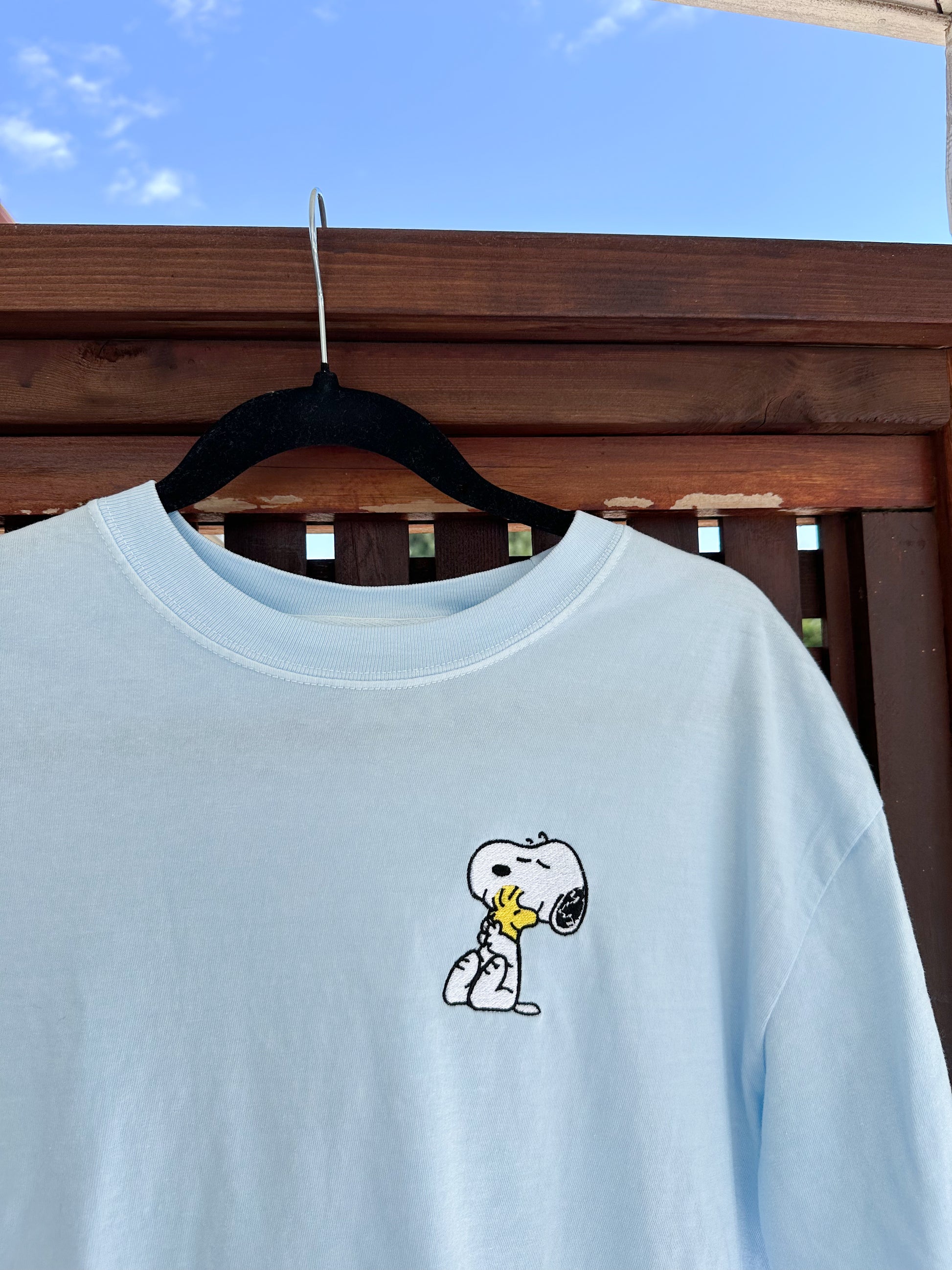 This sky blue tee features a sweet embroidered moment from a classic, beloved cartoon — a pup hugging his tiny sidekick with eyes closed and full heart. It’s a subtle nod to nostalgia, stitched into a clean, minimal fit you’ll want to wear on repeat.