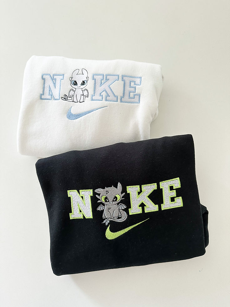 Channel your inner dragon rider with this adorable Toothless & Light Fury embroidered sweatshirt! Perfect for fans of these lovable dragons, this cozy and stylish design blends bold varsity lettering with high-quality detailed embroidery.